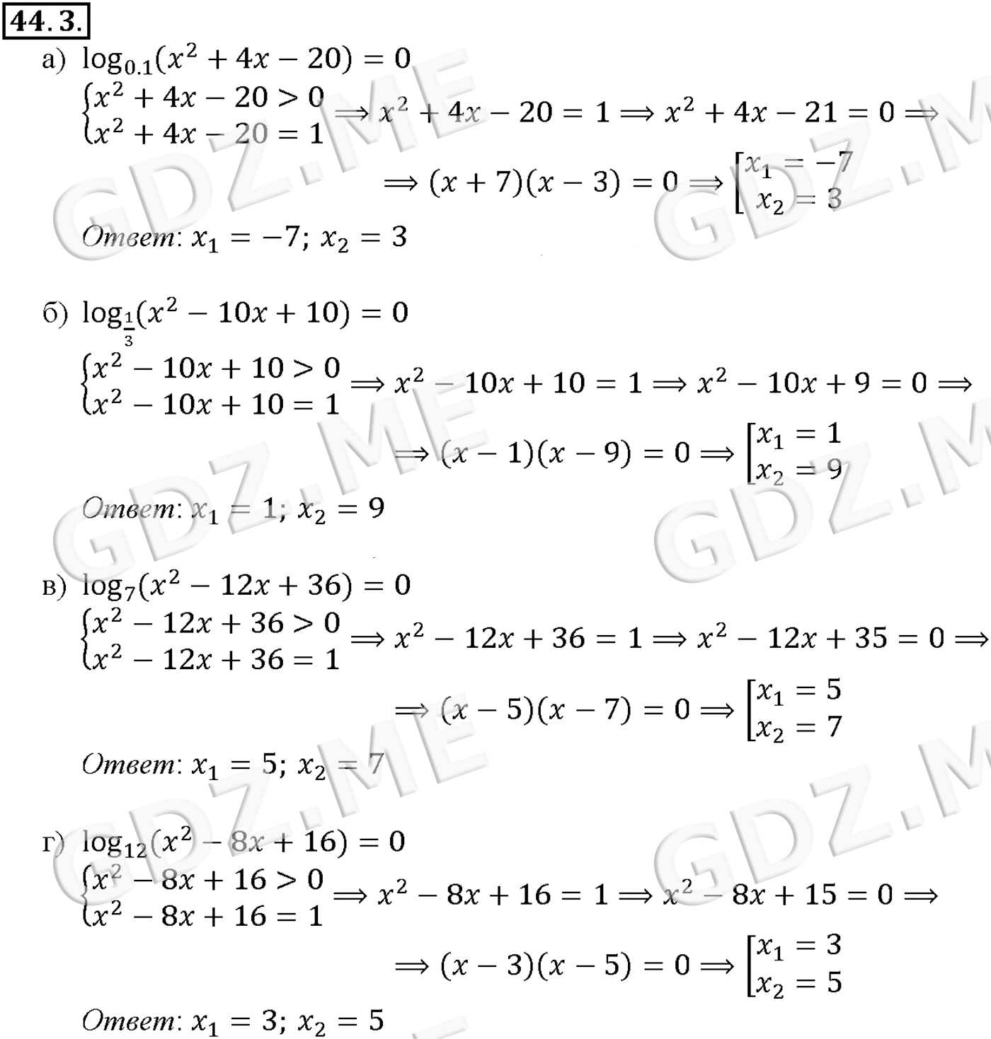 Подробный вариант решения из решебника (ГДЗ): Задание номер 44-3 (Глава 6 Степени и корни. Степенные функции. Глава 7 Показательная и логарифмическая функции. §44. Логарифмические уравнения) по предмету Алгебра, за 10 класс, авторы учебника Мордкович, Александрова.