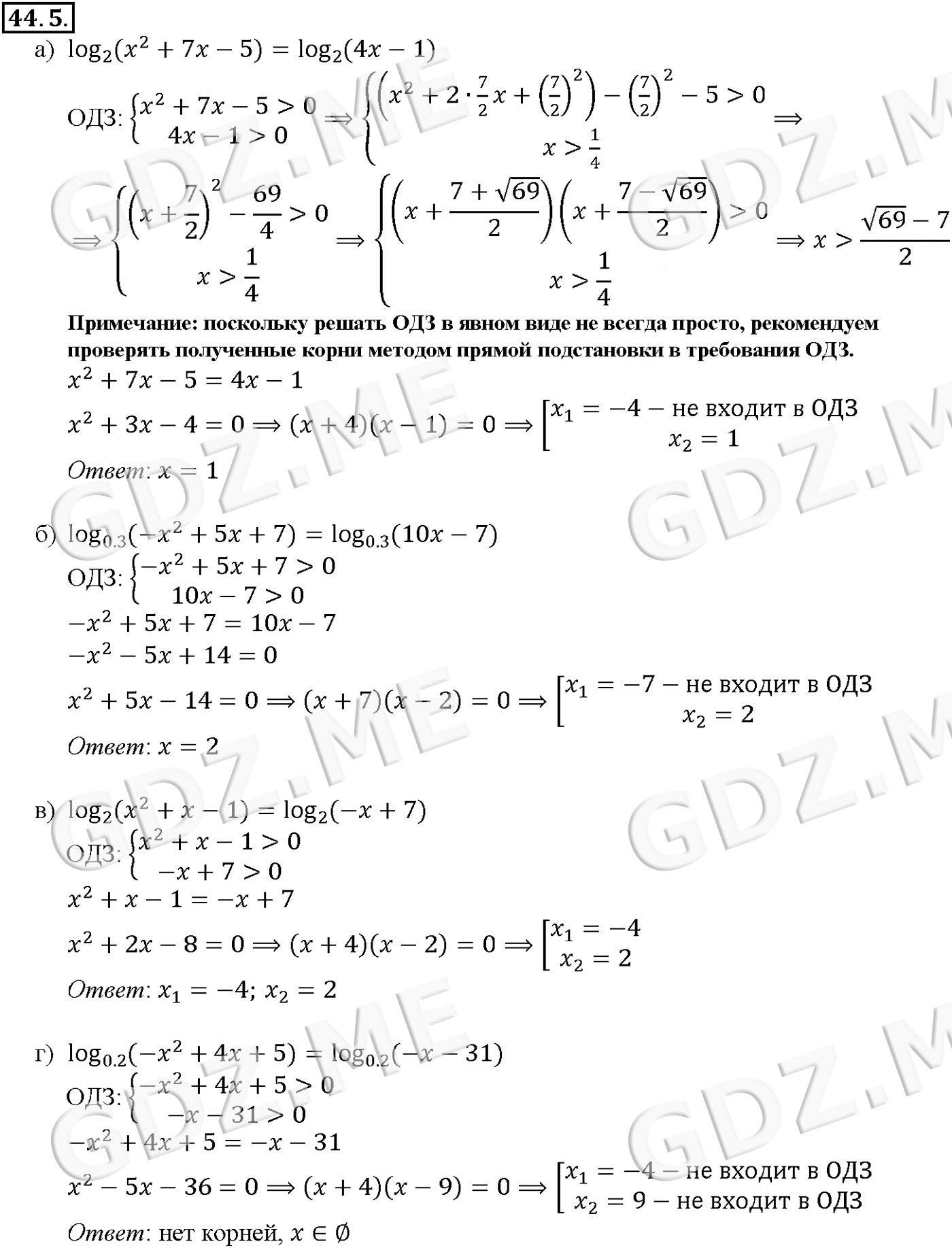 Подробный вариант решения из решебника (ГДЗ): Задание номер 44-5 (Глава 6 Степени и корни. Степенные функции. Глава 7 Показательная и логарифмическая функции. §44. Логарифмические уравнения) по предмету Алгебра, за 10 класс, авторы учебника Мордкович, Александрова.