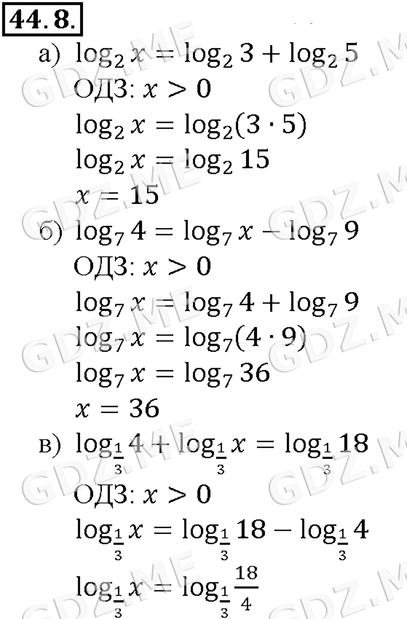Подробный вариант решения из решебника (ГДЗ): Задание номер 44-8_1 (Глава 6 Степени и корни. Степенные функции. Глава 7 Показательная и логарифмическая функции. §44. Логарифмические уравнения) по предмету Алгебра, за 10 класс, авторы учебника Мордкович, Александрова.