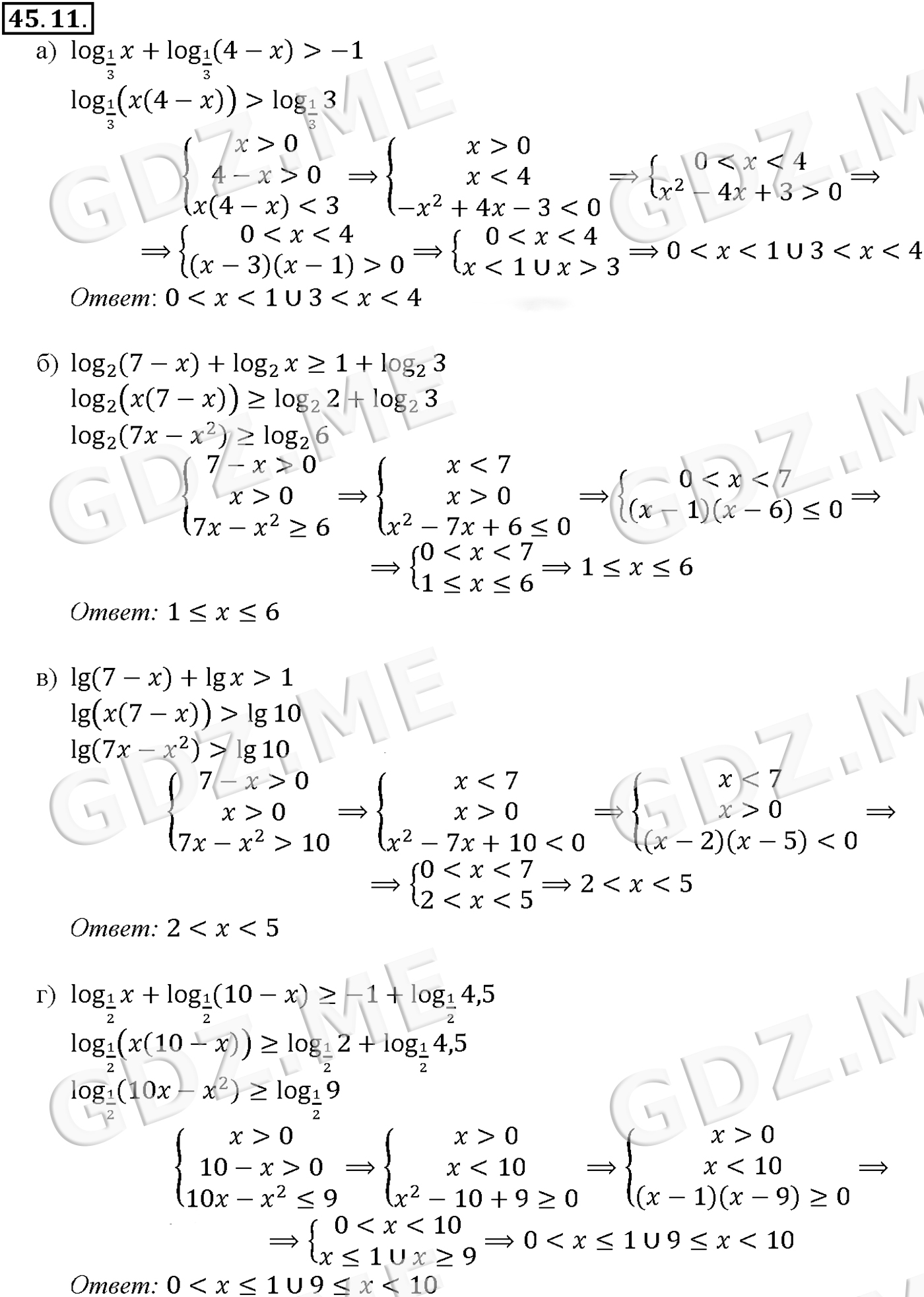Подробный вариант решения из решебника (ГДЗ): Задание номер 45-11 (Глава 6 Степени и корни. Степенные функции. Глава 7 Показательная и логарифмическая функции. §45. Логарифмические неравенства) по предмету Алгебра, за 10 класс, авторы учебника Мордкович, Александрова.