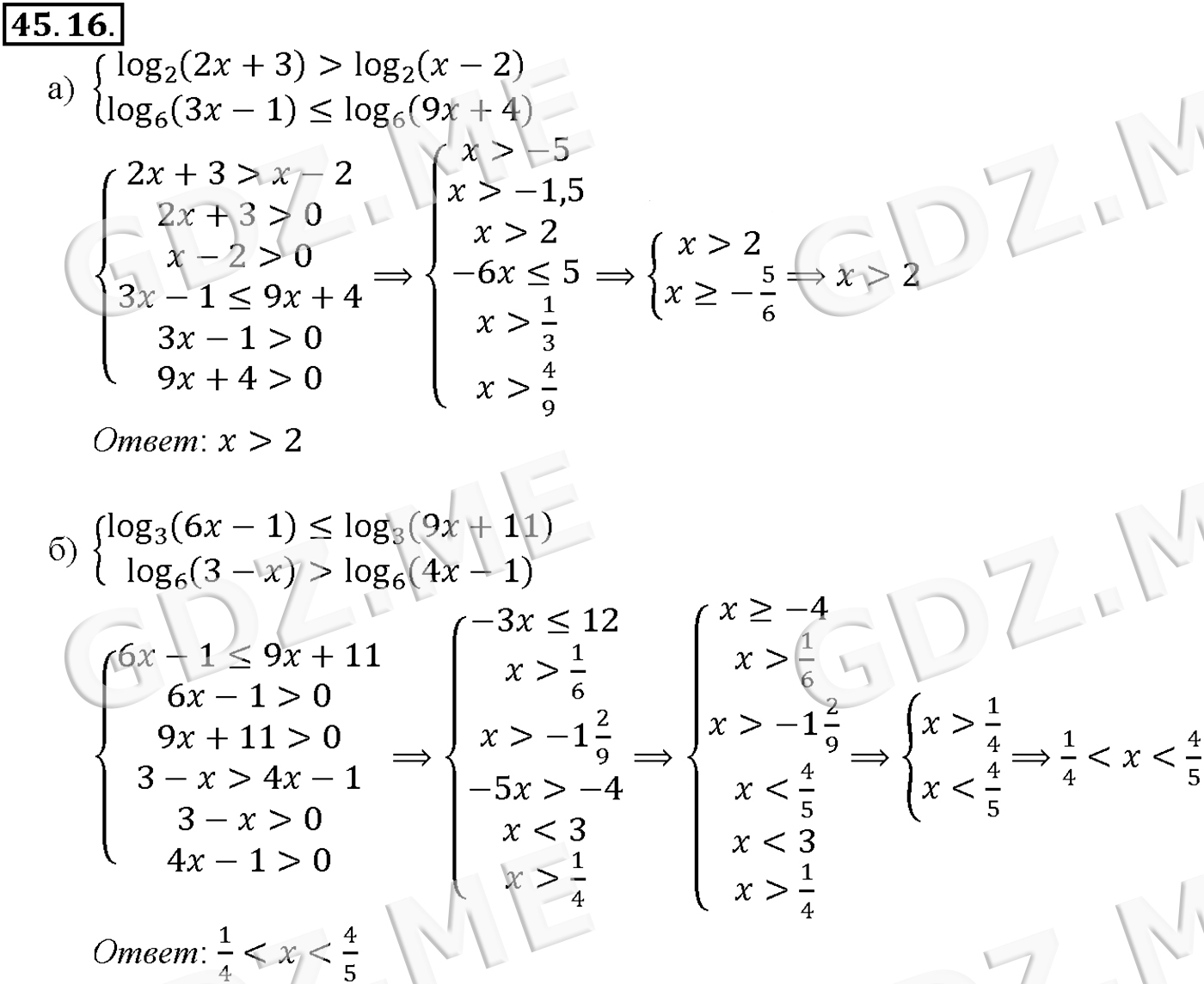 Подробный вариант решения из решебника (ГДЗ): Задание номер 45-16 (Глава 6 Степени и корни. Степенные функции. Глава 7 Показательная и логарифмическая функции. §45. Логарифмические неравенства) по предмету Алгебра, за 10 класс, авторы учебника Мордкович, Александрова.