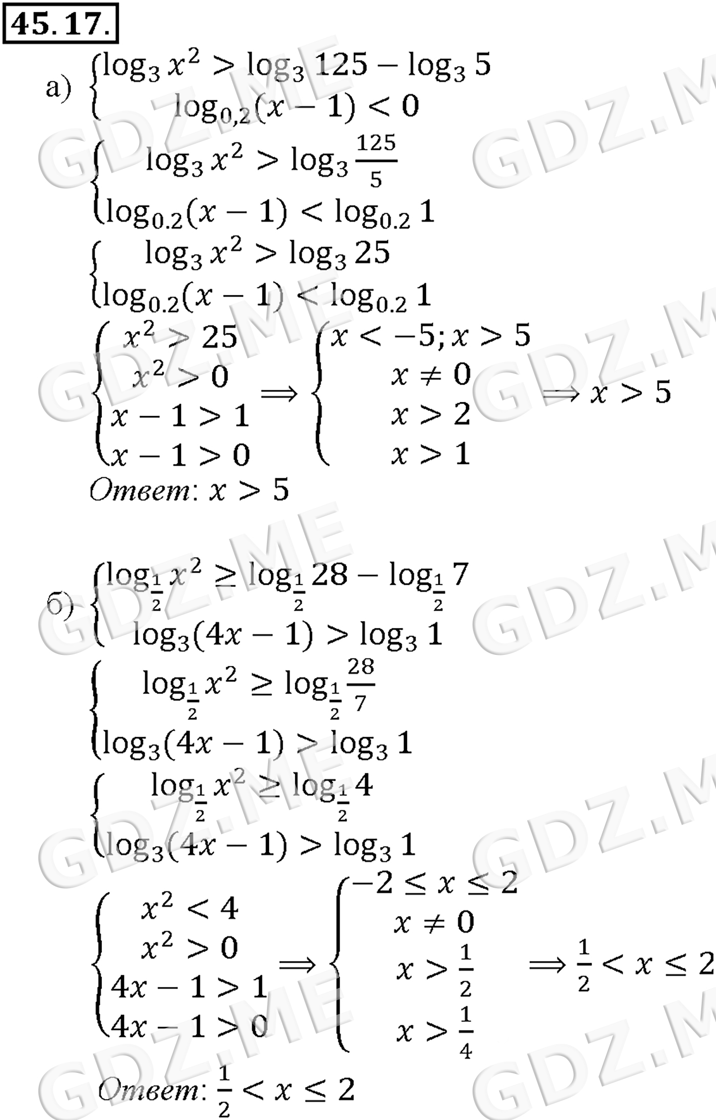 Подробный вариант решения из решебника (ГДЗ): Задание номер 45-17 (Глава 6 Степени и корни. Степенные функции. Глава 7 Показательная и логарифмическая функции. §45. Логарифмические неравенства) по предмету Алгебра, за 10 класс, авторы учебника Мордкович, Александрова.