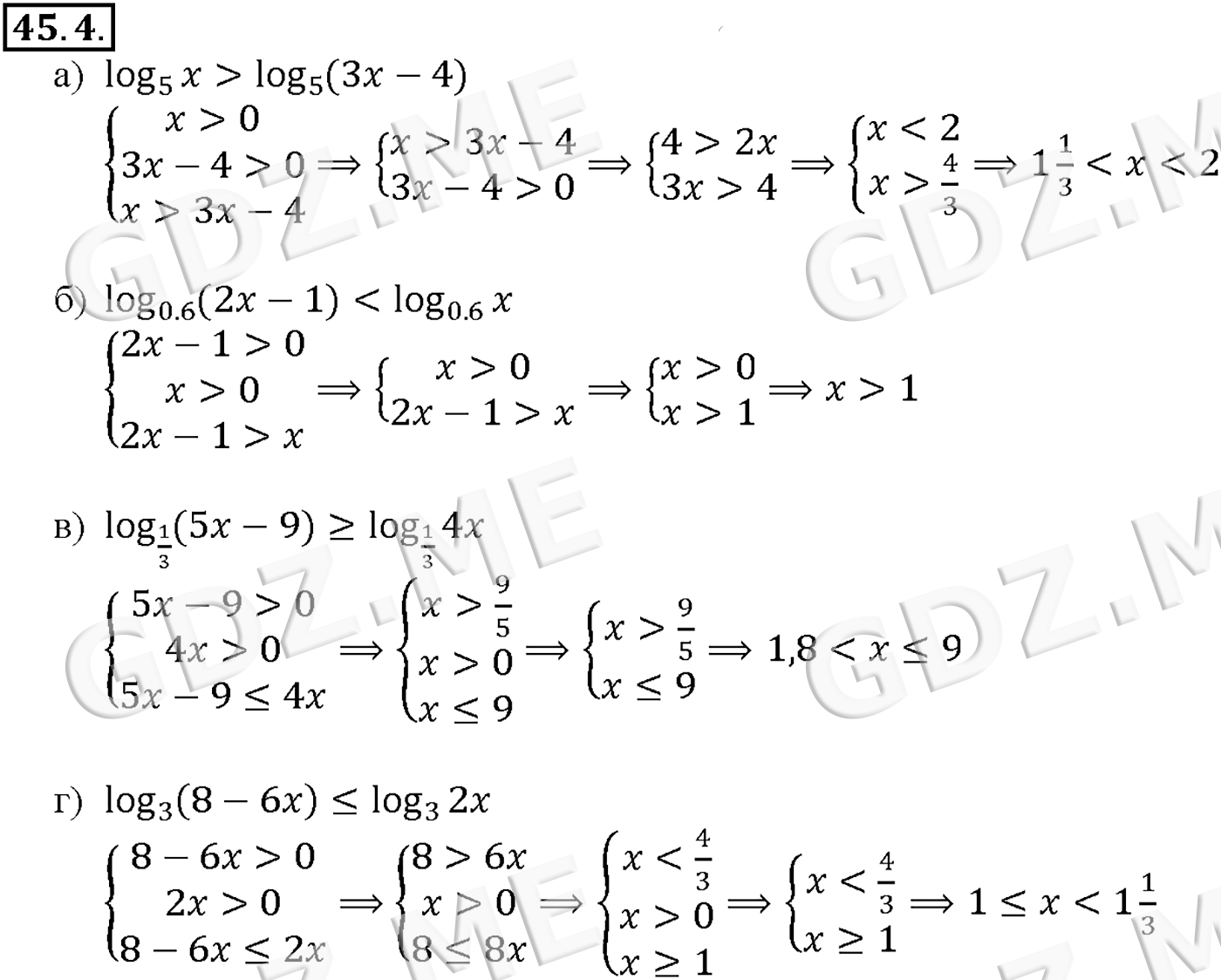 Подробный вариант решения из решебника (ГДЗ): Задание номер 45-4 (Глава 6 Степени и корни. Степенные функции. Глава 7 Показательная и логарифмическая функции. §45. Логарифмические неравенства) по предмету Алгебра, за 10 класс, авторы учебника Мордкович, Александрова.