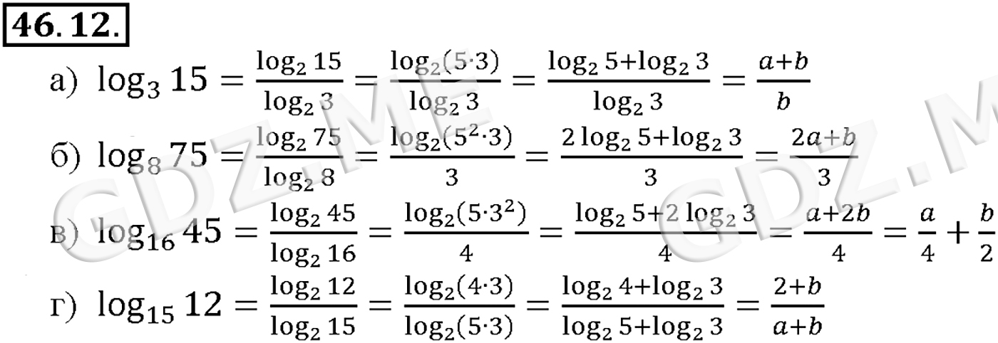 Подробный вариант решения из решебника (ГДЗ): Задание номер 46-12 (Глава 6 Степени и корни. Степенные функции. Глава 7 Показательная и логарифмическая функции. §46. Переход к новому основанию логарифма) по предмету Алгебра, за 10 класс, авторы учебника Мордкович, Александрова.