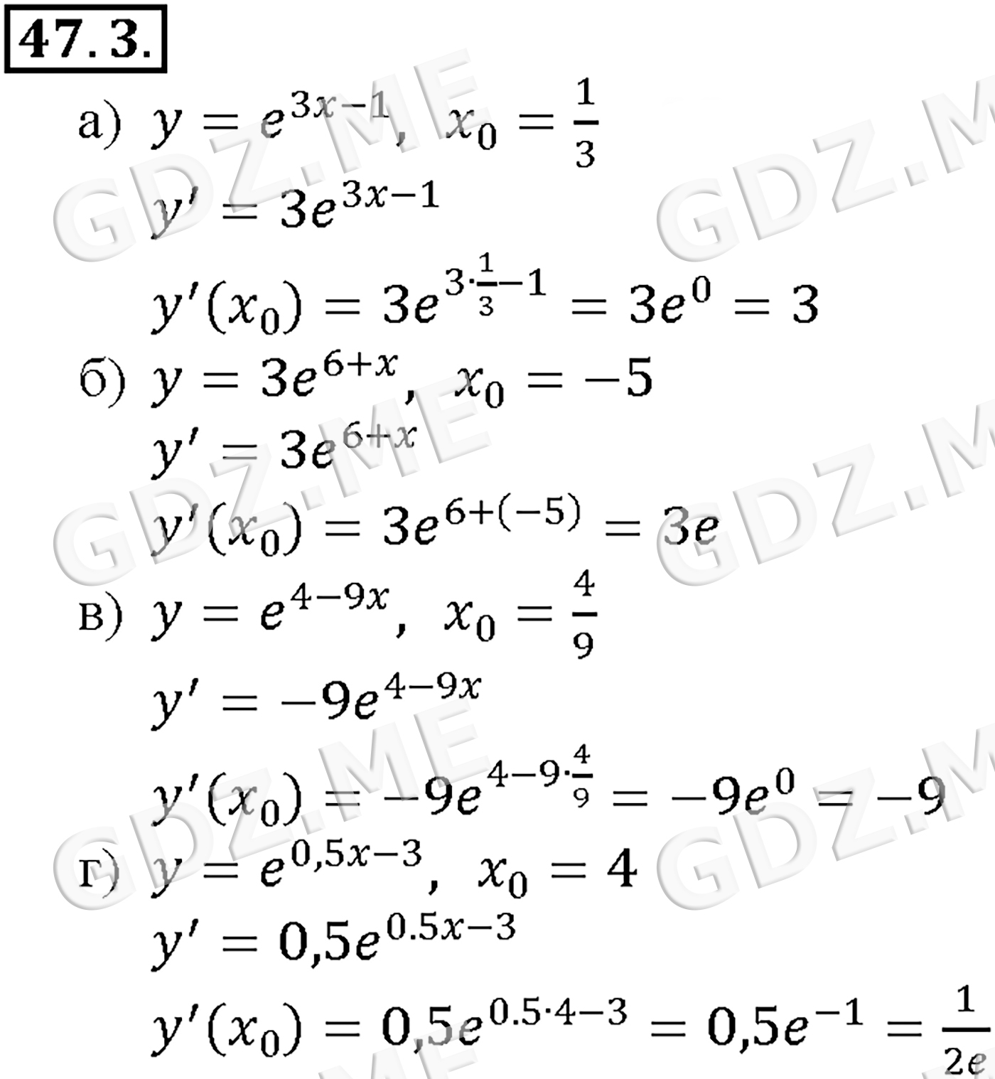 Подробный вариант решения из решебника (ГДЗ): Задание номер 47-3 (Глава 6 Степени и корни. Степенные функции. Глава 7 Показательная и логарифмическая функции. §47. Дифференцирование показательной и логарифмической функций) по предмету Алгебра, за 10 класс, авторы учебника Мордкович, Александрова.