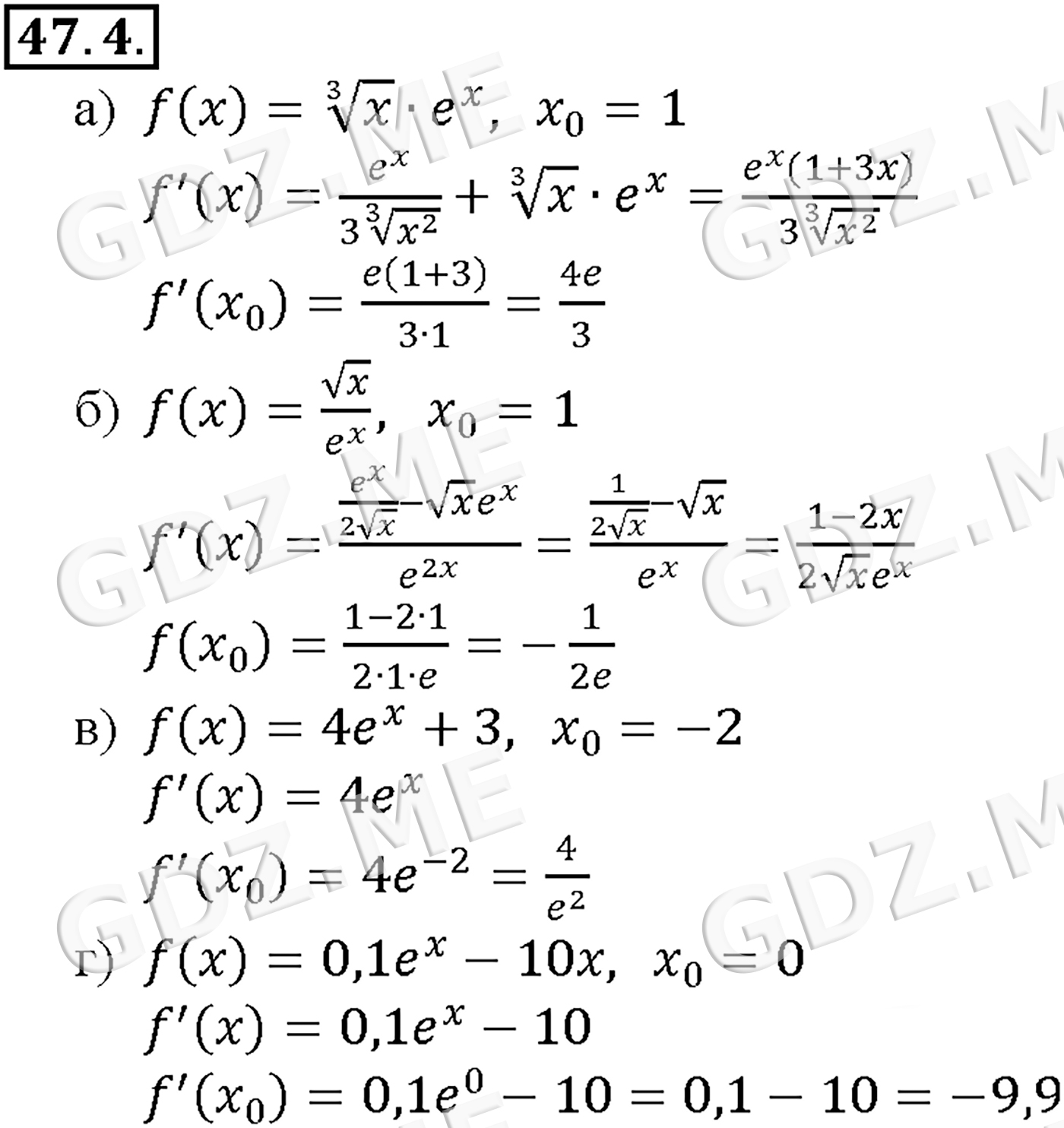 Подробный вариант решения из решебника (ГДЗ): Задание номер 47-4 (Глава 6 Степени и корни. Степенные функции. Глава 7 Показательная и логарифмическая функции. §47. Дифференцирование показательной и логарифмической функций) по предмету Алгебра, за 10 класс, авторы учебника Мордкович, Александрова.