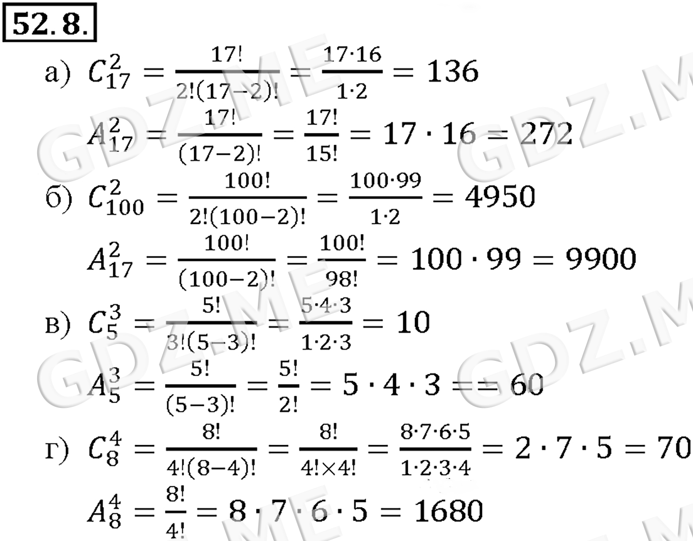 Подробный вариант решения из решебника (ГДЗ): Задание номер 52-8 (Глава 8 Первообразная и интеграл. Глава 9 Элементы математической статистики, комбинаторики и теории. §52. Сочетания и размещения) по предмету Алгебра, за 10 класс, авторы учебника Мордкович, Александрова.