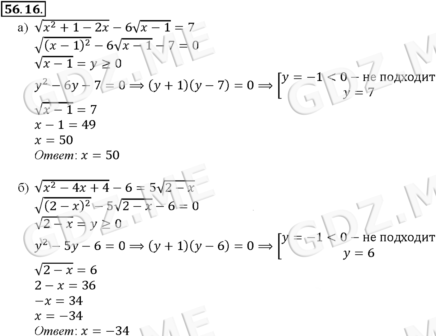 Подробный вариант решения из решебника (ГДЗ): Задание номер 56-16 (Глава 9 Элементы математической статистики, комбинаторики и теории. Глава 10 Уравнения и неравенства. Системы уравнений и неравенств. §56. Общие методы решения уравнений) по предмету Алгебра, за 10 класс, авторы учебника Мордкович, Александрова.
