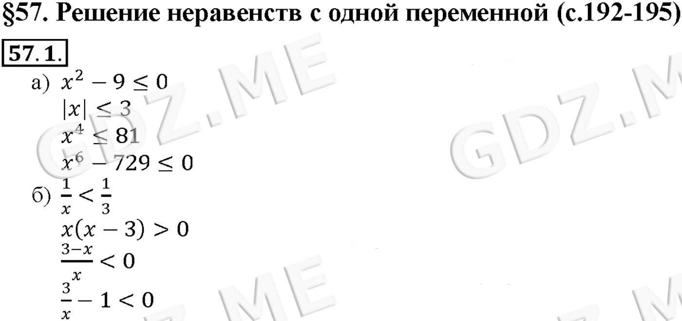 Подробный вариант решения из решебника (ГДЗ): Задание номер 57-1 (Глава 9 Элементы математической статистики, комбинаторики и теории. Глава 10 Уравнения и неравенства. Системы уравнений и неравенств. §57. Решение неравенств с одной переменной) по предмету Алгебра, за 10 класс, авторы учебника Мордкович, Александрова.