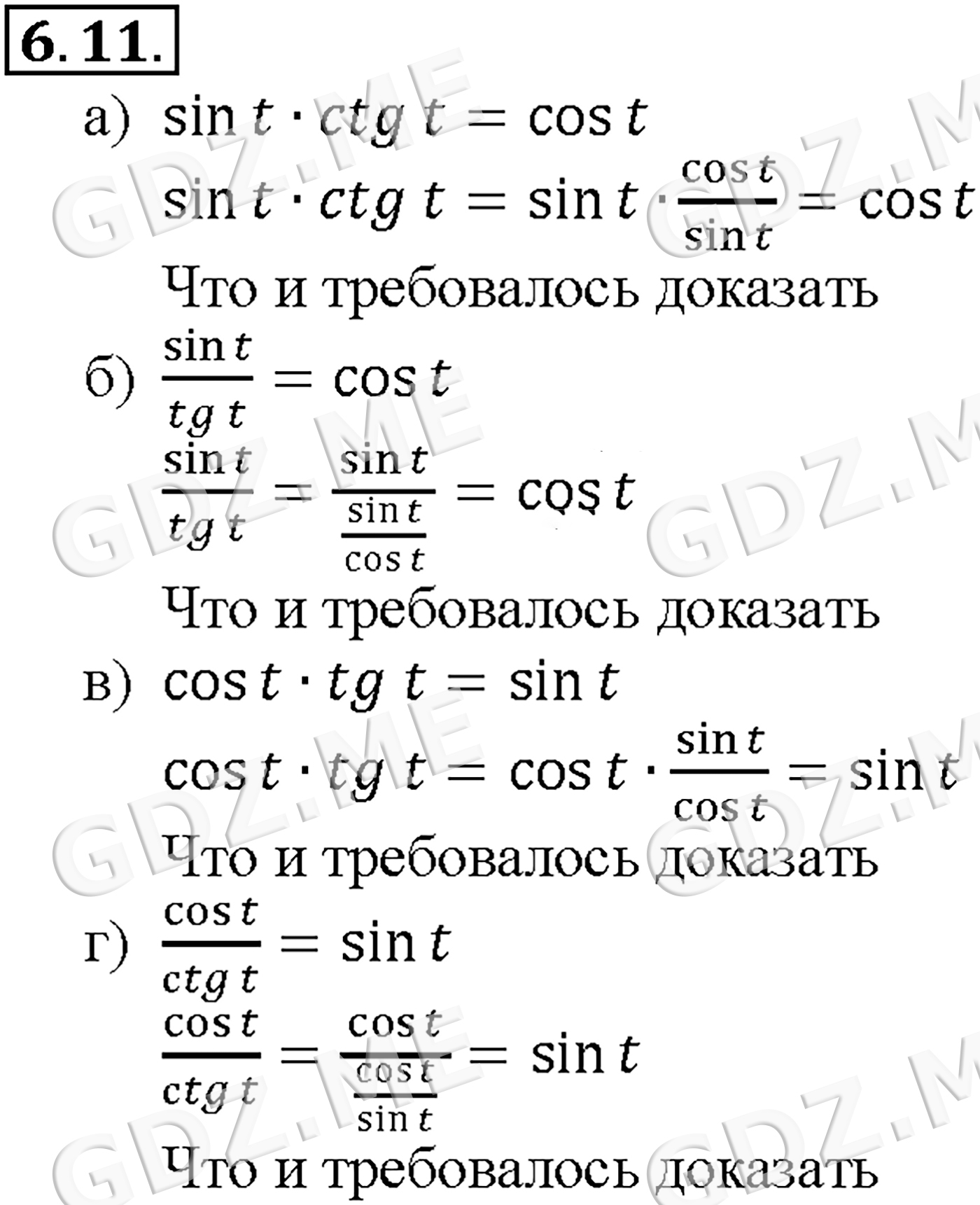 Подробный вариант решения из решебника (ГДЗ): Задание номер 6-11 (Глава 2 Тригонометрические функции. §6. Синус и косинус. Тангенс и котангенс) по предмету Алгебра, за 10 класс, авторы учебника Мордкович, Александрова.