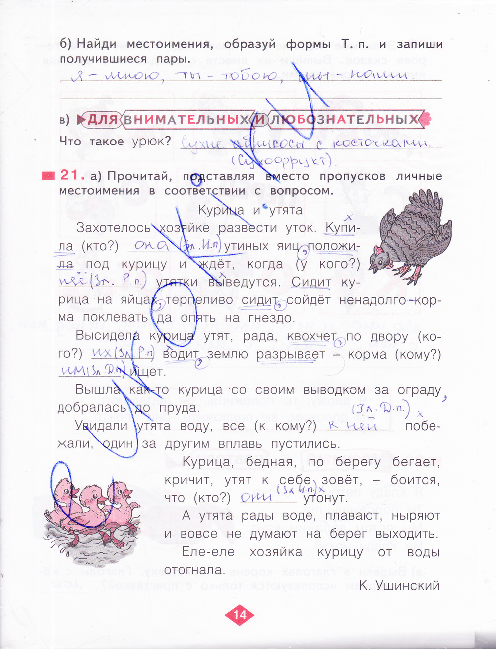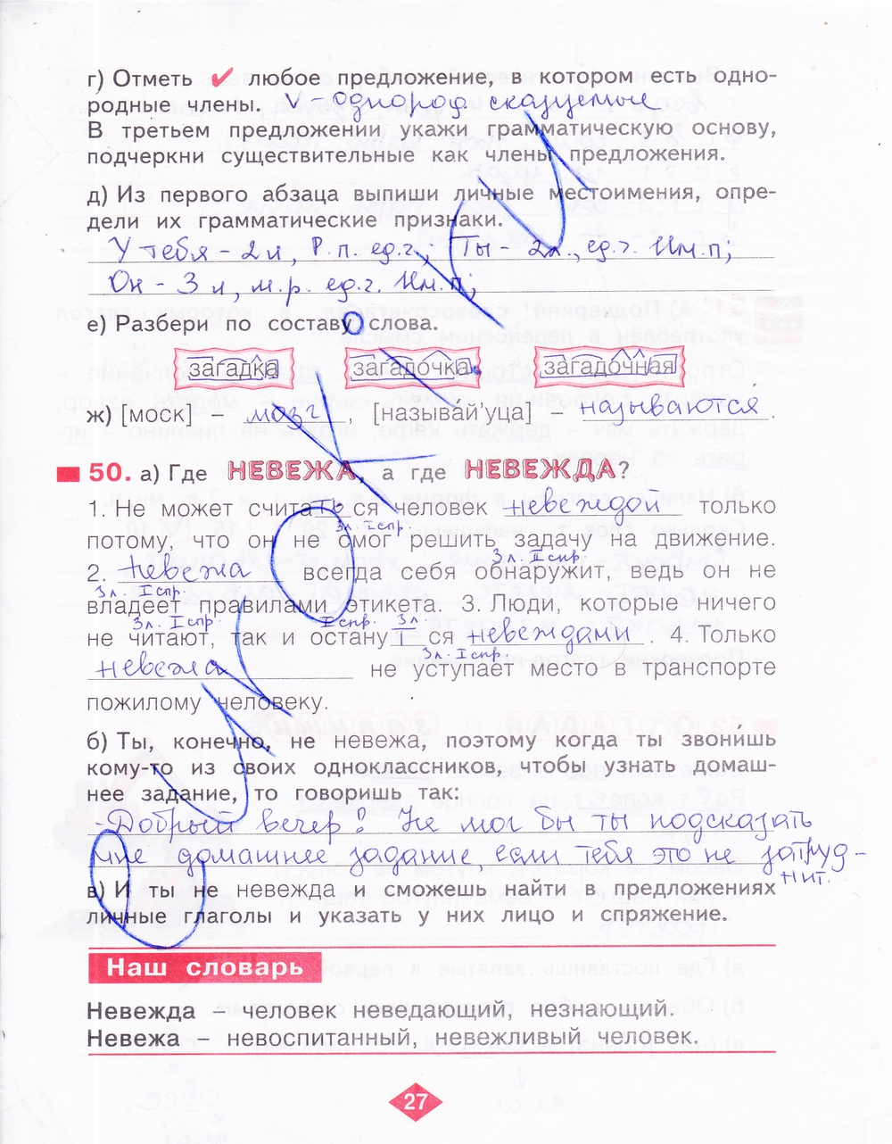 Кроме вида элементарного ответа, где необходимо сделать выбор одного правильного варианта, в рабочей тетради присутствуют решения по заданиям, представленным в рубриках «Для внимательных и любознательных», «Отгадай и запиши». Они требуют применения точных знаний и аналитического мышления. На все указанные упражнения в пособии поданы проверенные и полные ответы, способствующие закреплению навыков устной и письменной речи.
