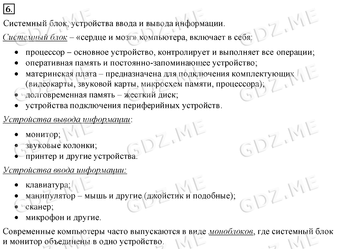 Подробный вариант решения из решебника (ГДЗ): Задание номер 6 (§2. Компьютер — универсальная машина для работы с информацией. Cтраницы 10-16) по предмету Информатика, за 5 класс, авторы учебника Босова.