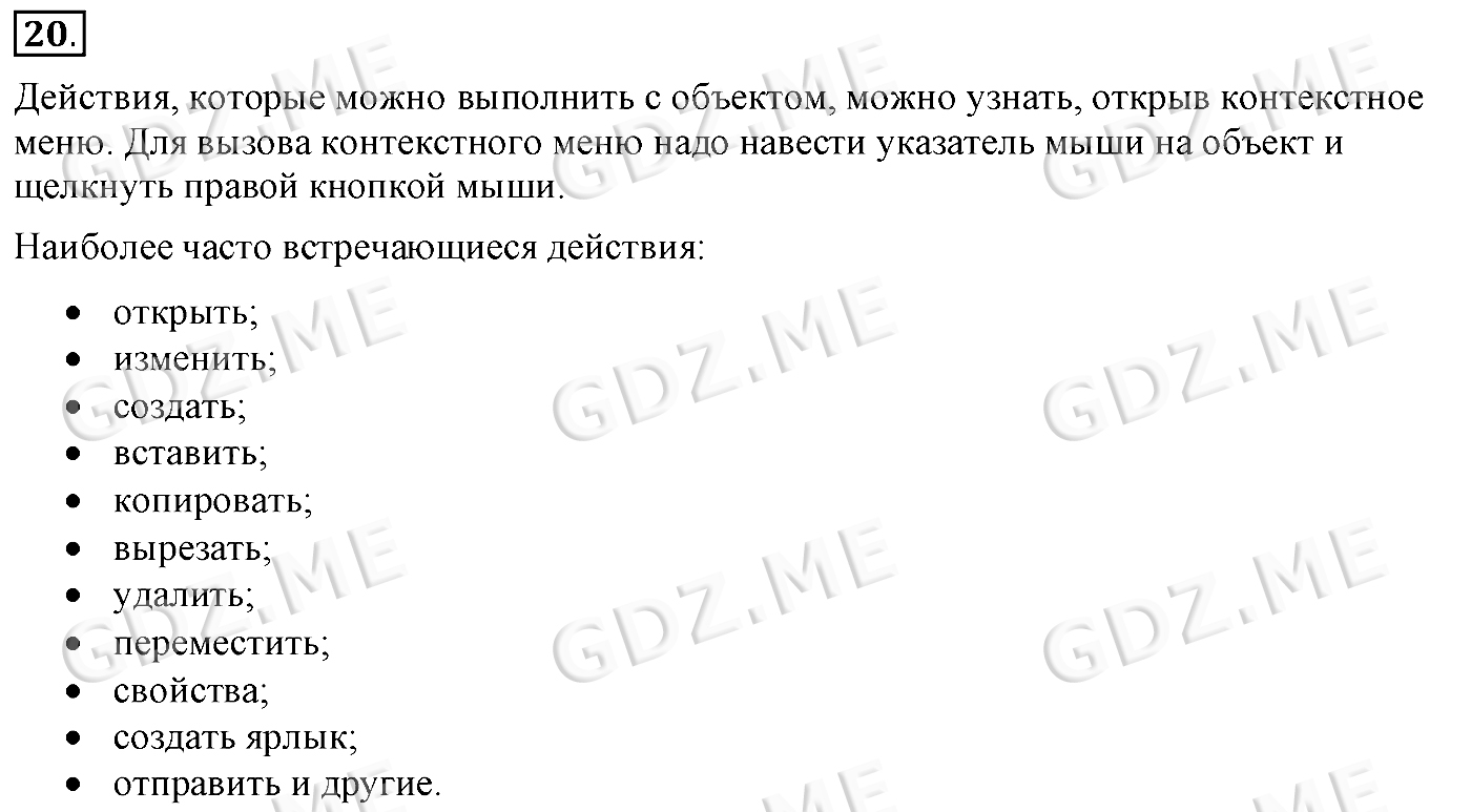 Подробный вариант решения из решебника (ГДЗ): Задание номер 20 (§4. Управление компьютером. Cтраницы 25-34) по предмету Информатика, за 5 класс, авторы учебника Босова.