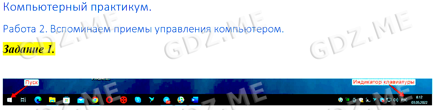 Подробный вариант решения из решебника (ГДЗ): Задание номер 1 (§4. Управление компьютером. Cтраницы 25-34:. Компьютерный практикум. Работа 2. "Вспоминаем приёмы управления компьютером") по предмету Информатика, за 5 класс, авторы учебника Босова.