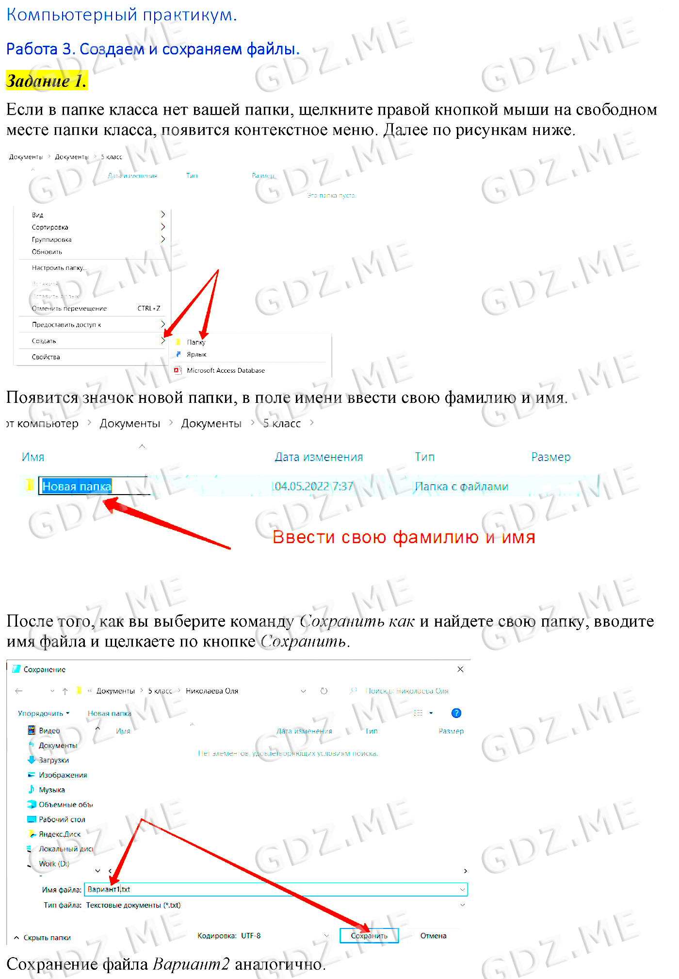 Подробный вариант решения из решебника (ГДЗ): Задание номер 1 (§5. Хранение информации. Cтраницы 35-40:. Компьютерный практикум. Работа 3. "Создаём и сохраняем файлы") по предмету Информатика, за 5 класс, авторы учебника Босова.