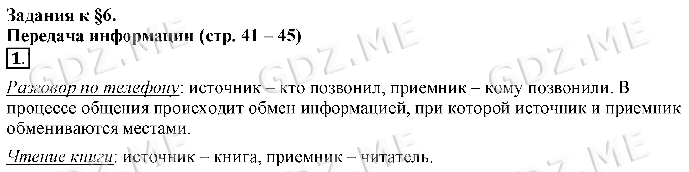 Подробный вариант решения из решебника (ГДЗ): Задание номер 1 (§6. Передача информации. Cтраницы 41-45) по предмету Информатика, за 5 класс, авторы учебника Босова.