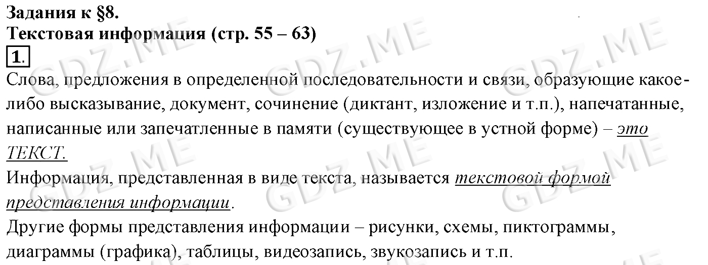 Подробный вариант решения из решебника (ГДЗ): Задание номер 1 (§8. Текстовая информация. Cтраницы 55-63) по предмету Информатика, за 5 класс, авторы учебника Босова.