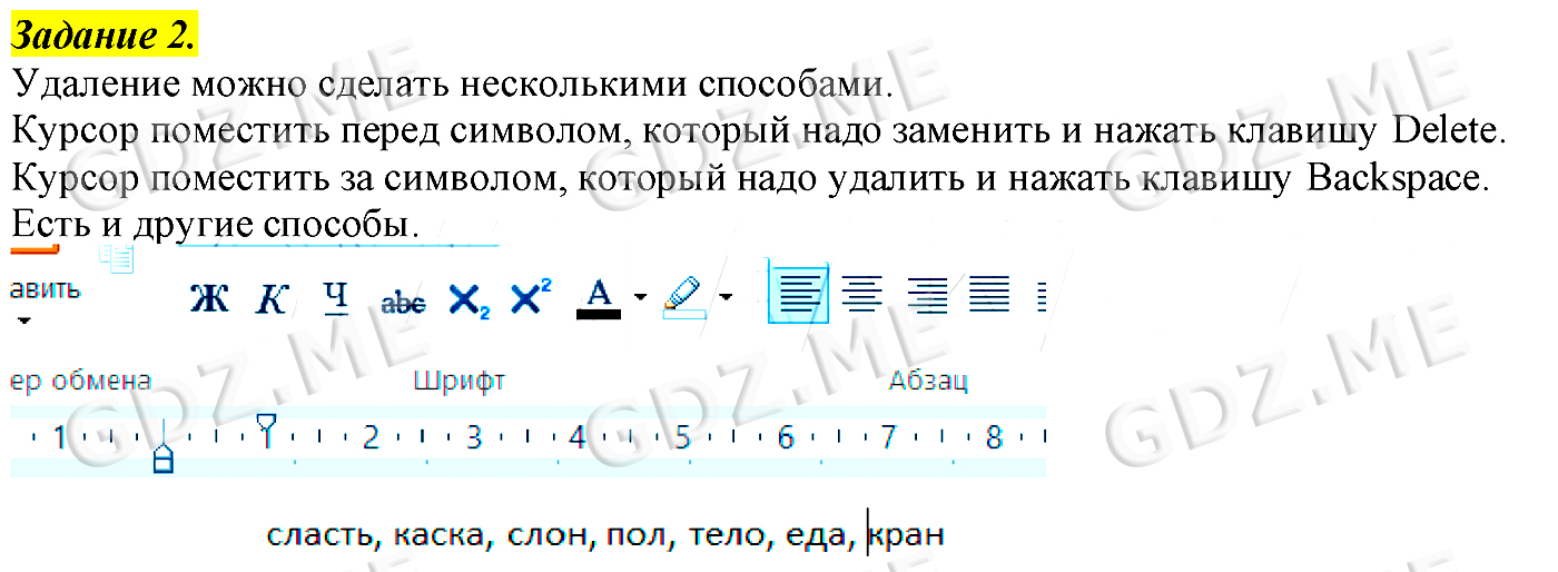 Подробный вариант решения из решебника (ГДЗ): Задание номер 2 (§8. Текстовая информация. Cтраницы 55-63:. Компьютерный практикум. Работа 6. "Редактируем текст") по предмету Информатика, за 5 класс, авторы учебника Босова.