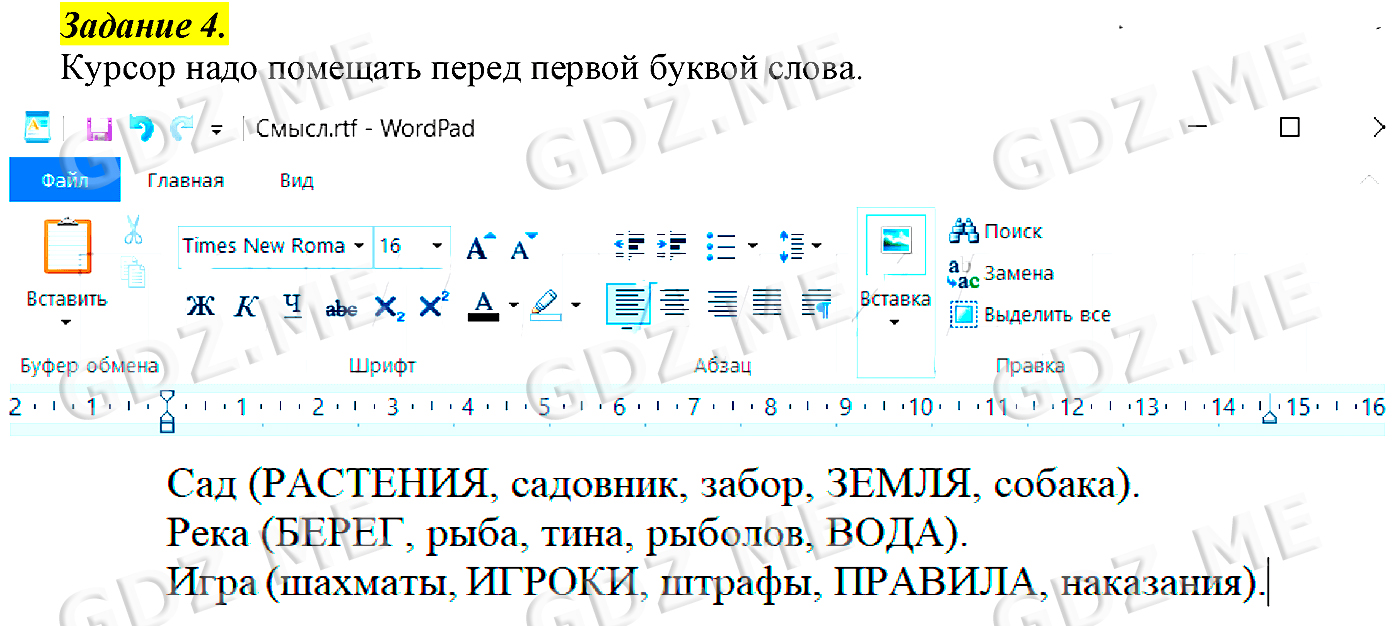 Подробный вариант решения из решебника (ГДЗ): Задание номер 4 (§8. Текстовая информация. Cтраницы 55-63:. Компьютерный практикум. Работа 6. "Редактируем текст") по предмету Информатика, за 5 класс, авторы учебника Босова.