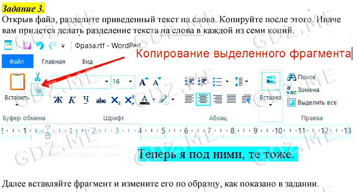 Подробный вариант решения из решебника (ГДЗ): Задание номер 3 (§8. Текстовая информация. Cтраницы 55-63:. Компьютерный практикум. Работа 7. "Работаем с фрагментами текста") по предмету Информатика, за 5 класс, авторы учебника Босова.
