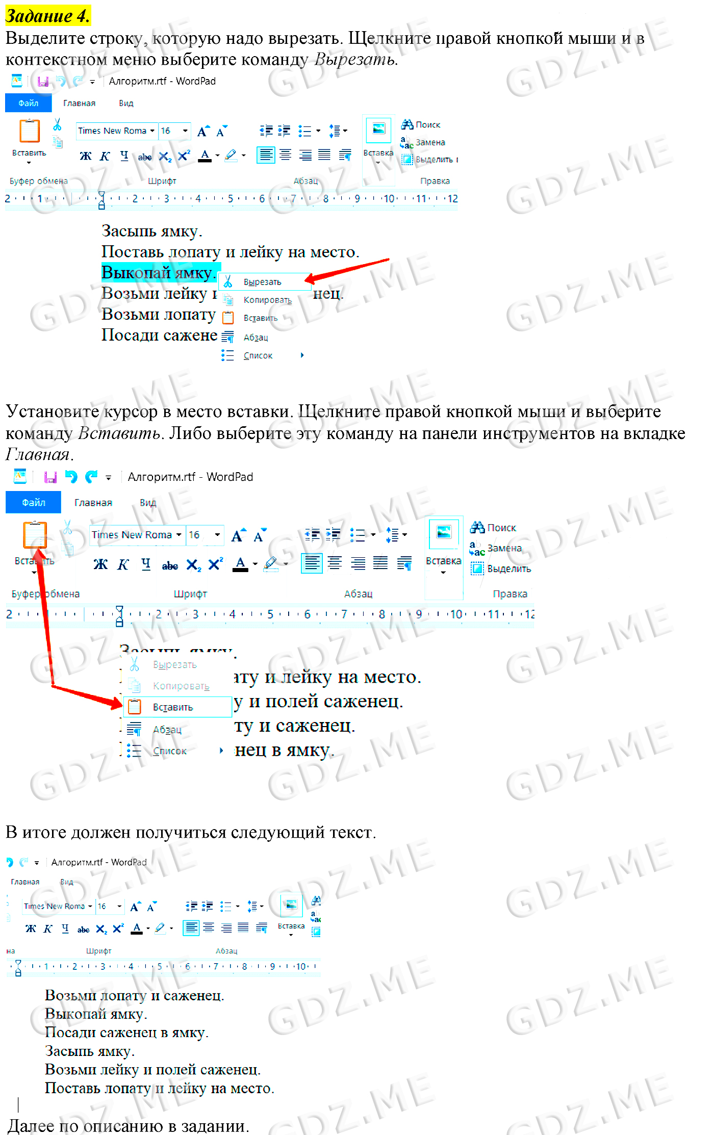 Подробный вариант решения из решебника (ГДЗ): Задание номер 4 (§8. Текстовая информация. Cтраницы 55-63:. Компьютерный практикум. Работа 7. "Работаем с фрагментами текста") по предмету Информатика, за 5 класс, авторы учебника Босова.