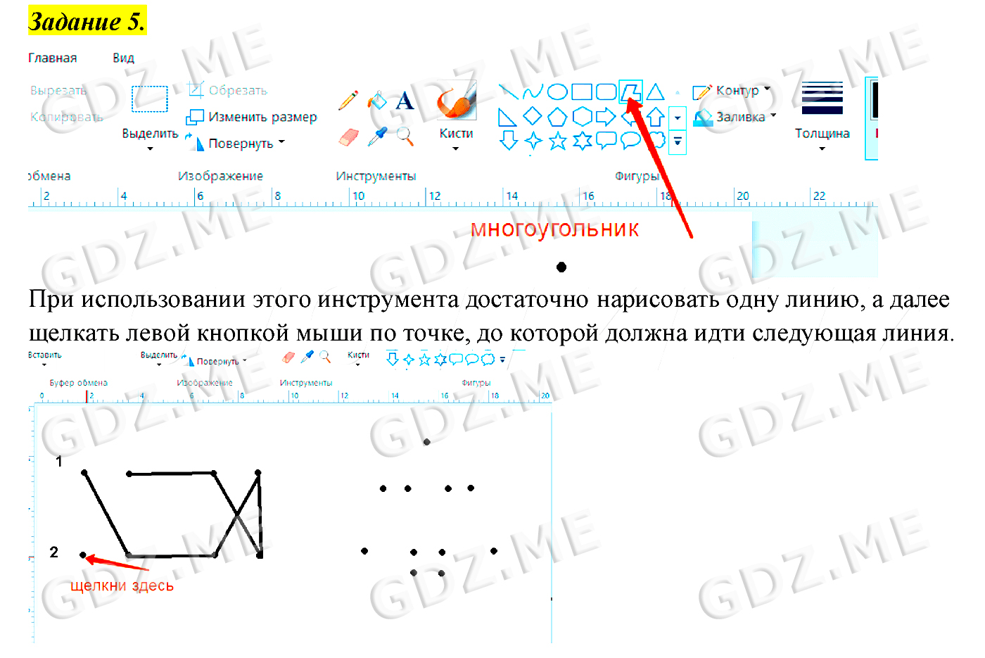 Подробный вариант решения из решебника (ГДЗ): Задание номер 5 (§11. Компьютерная графика. Cтраницы 74-82:. Компьютерный практикум. Работа 11. "Изучаем инструменты графического редактора") по предмету Информатика, за 5 класс, авторы учебника Босова.