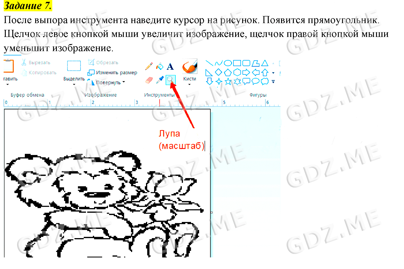 Подробный вариант решения из решебника (ГДЗ): Задание номер 7 (§11. Компьютерная графика. Cтраницы 74-82:. Компьютерный практикум. Работа 11. "Изучаем инструменты графического редактора") по предмету Информатика, за 5 класс, авторы учебника Босова.
