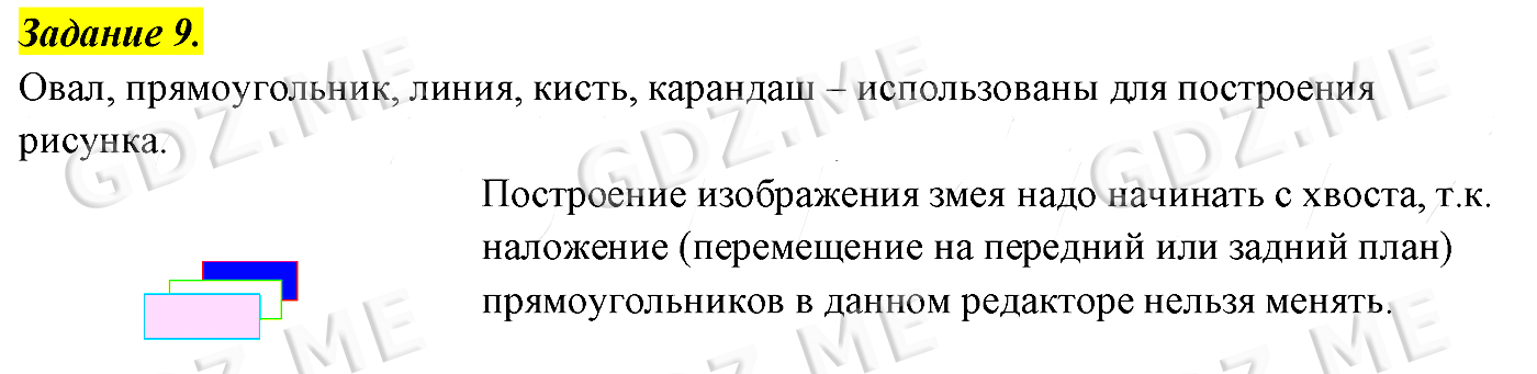 Подробный вариант решения из решебника (ГДЗ): Задание номер 9 (§11. Компьютерная графика. Cтраницы 74-82:. Компьютерный практикум. Работа 11. "Изучаем инструменты графического редактора") по предмету Информатика, за 5 класс, авторы учебника Босова.