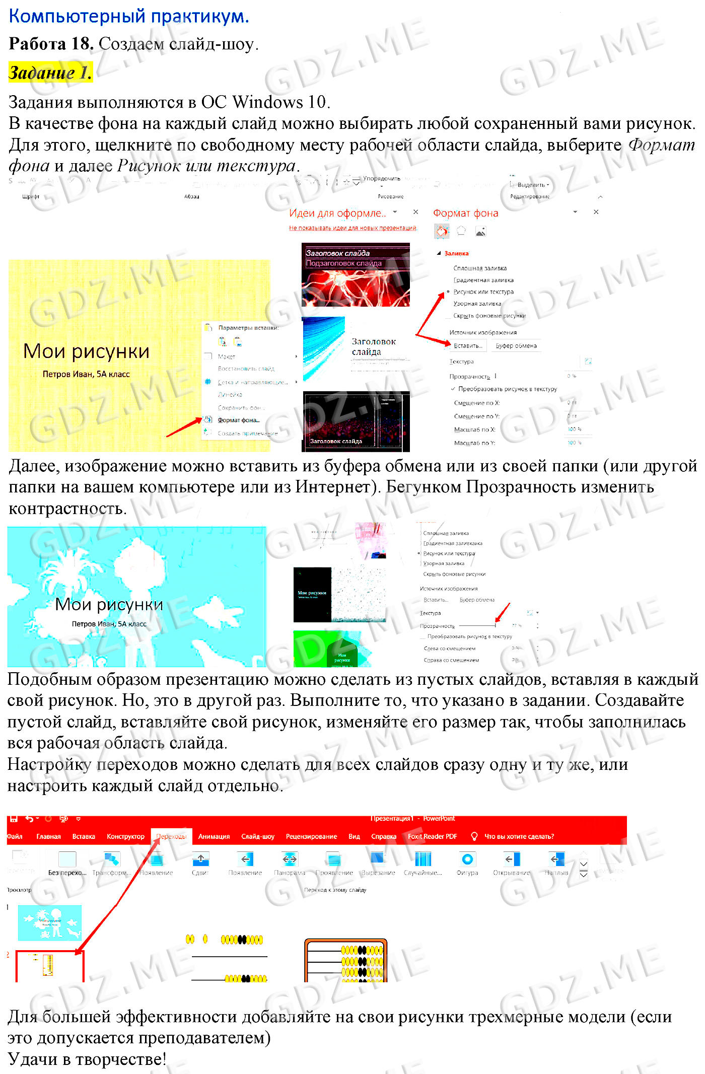 Подробный вариант решения из решебника (ГДЗ): Задание номер 1 (§12. Обработка информации. Cтраницы 74-82:. Компьютерный практикум. Работа 18. "Создаём слайд-шоу") по предмету Информатика, за 5 класс, авторы учебника Босова.