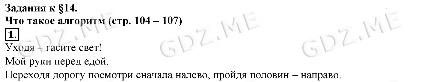 Подробный вариант решения из решебника (ГДЗ): Задание номер 1 (§14. Что такое алгоритм. Cтраницы 104-107) по предмету Информатика, за 6 класс, авторы учебника Босова.