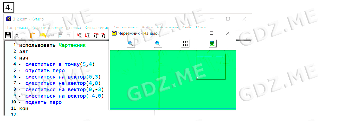 Подробный вариант решения из решебника (ГДЗ): Задание номер 4 (§18. Управление исполнителем Чертёжник. Cтраницы 125-138) по предмету Информатика, за 6 класс, авторы учебника Босова.