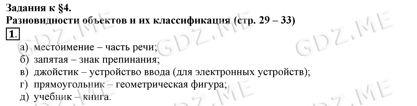Подробный вариант решения из решебника (ГДЗ): Задание номер 1 (§4. Разновидности объектов и их классификация. Cтраницы 29-33) по предмету Информатика, за 6 класс, авторы учебника Босова.