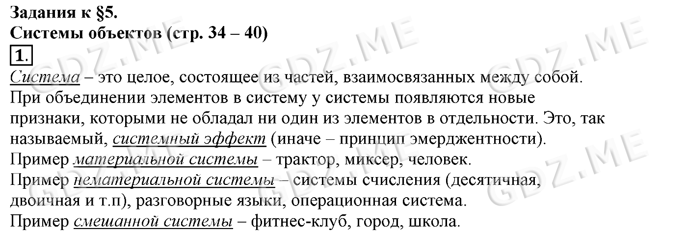 Подробный вариант решения из решебника (ГДЗ): Задание номер 1 (§5. Системы объектов. Cтраницы 34-40) по предмету Информатика, за 6 класс, авторы учебника Босова.