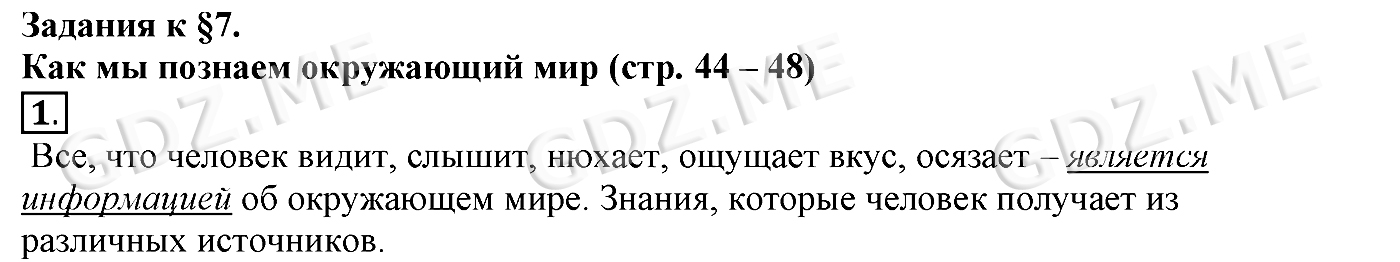 Подробный вариант решения из решебника (ГДЗ): Задание номер 1 (§7. Как мы познаём окружающий мир. Cтраницы 44-48) по предмету Информатика, за 6 класс, авторы учебника Босова.