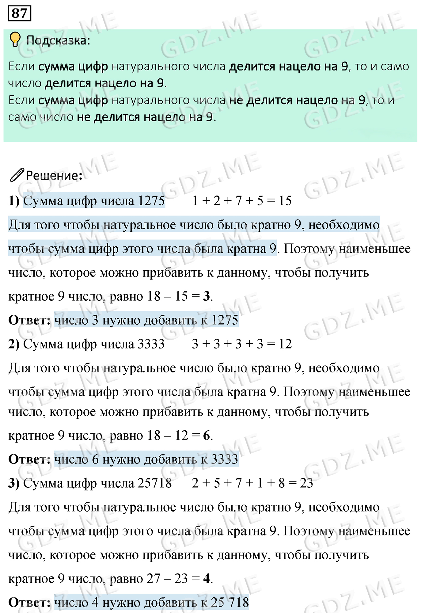 Подробный вариант решения из решебника (ГДЗ): Задание номер 87_1 (Глава 1 Делимость натуральных чисел. §3. Признаки делимости на 9 и на 3) по предмету Математика, за 6 класс, авторы учебника Мерзляк, Полонский, Якир.