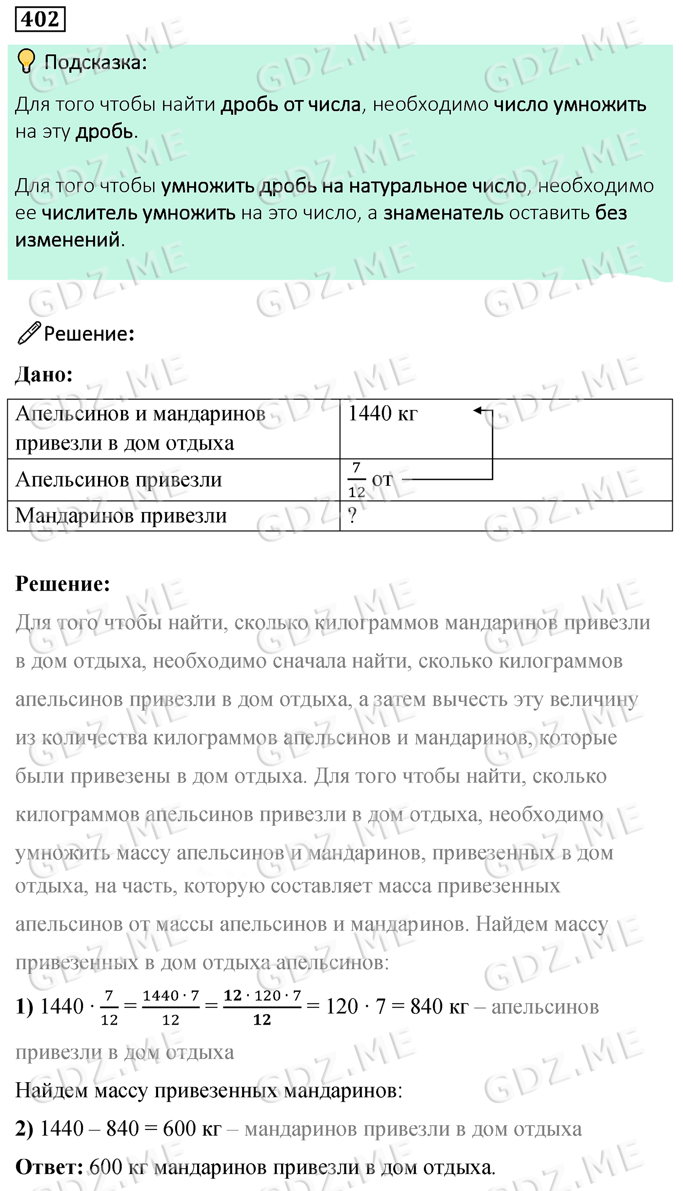 Подробный вариант решения из решебника (ГДЗ): Задание номер 402 (Глава 2 Обыкновенные дроби. §12. Нахождение дроби от числа) по предмету Математика, за 6 класс, авторы учебника Мерзляк, Полонский, Якир.