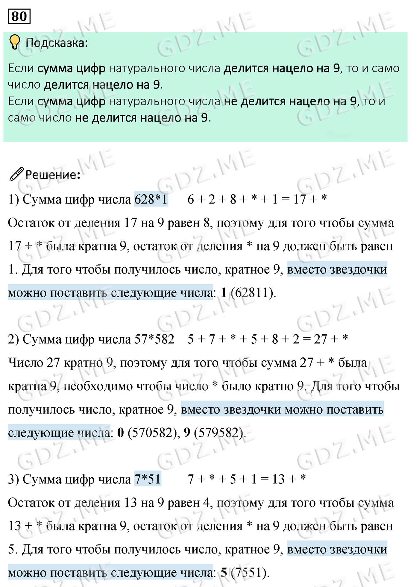 Подробный вариант решения из решебника (ГДЗ): Задание номер 80 (Глава 1 Делимость натуральных чисел. §3. Признаки делимости на 9 и на 3) по предмету Математика, за 6 класс, авторы учебника Мерзляк, Полонский, Якир.