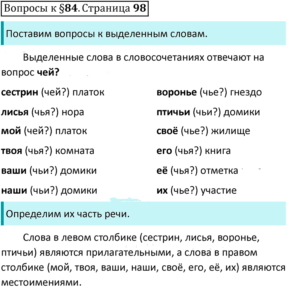 Подробный вариант решения из решебника (ГДЗ): Задание номер 98.v.84 (Учебник 2023 года, Часть 2. Вопросы к параграфам) по предмету Русский язык, за 6 класс, авторы учебника Ладыженская, Баранов, Тростенцова.