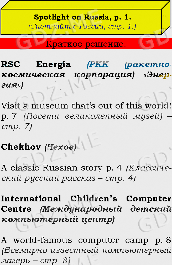 Подробный вариант решения из решебника (ГДЗ): Задание номер 1 (Spotlight on russia) по предмету Английский язык, за 7 класс, авторы учебника Ю.Е. Ваулина, Д. Дули, О.Е. Подолянко, В. Эванс.