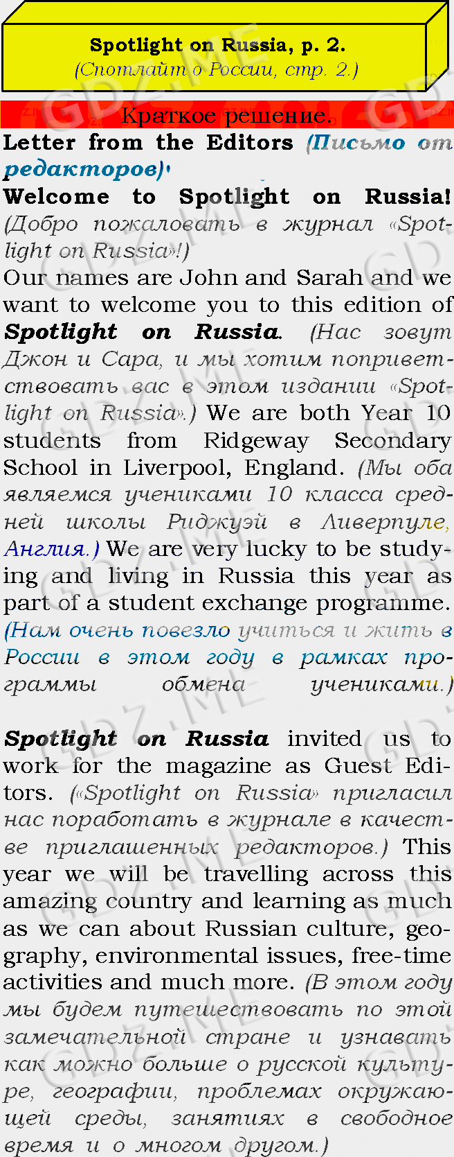 Подробный вариант решения из решебника (ГДЗ): Задание номер 2 (Spotlight on russia) по предмету Английский язык, за 7 класс, авторы учебника Ю.Е. Ваулина, Д. Дули, О.Е. Подолянко, В. Эванс.