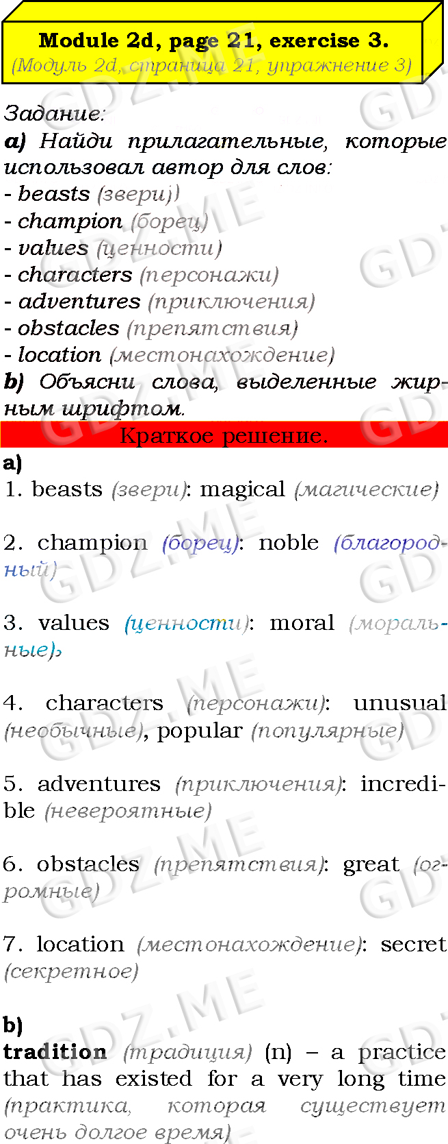 Подробный вариант решения из решебника (ГДЗ): Страница номер 21-2d-3 (Module 2. Tale time. Страница 21) по предмету Английский язык, за 7 класс, авторы учебника Ю.Е. Ваулина, Д. Дули, О.Е. Подолянко, В. Эванс.