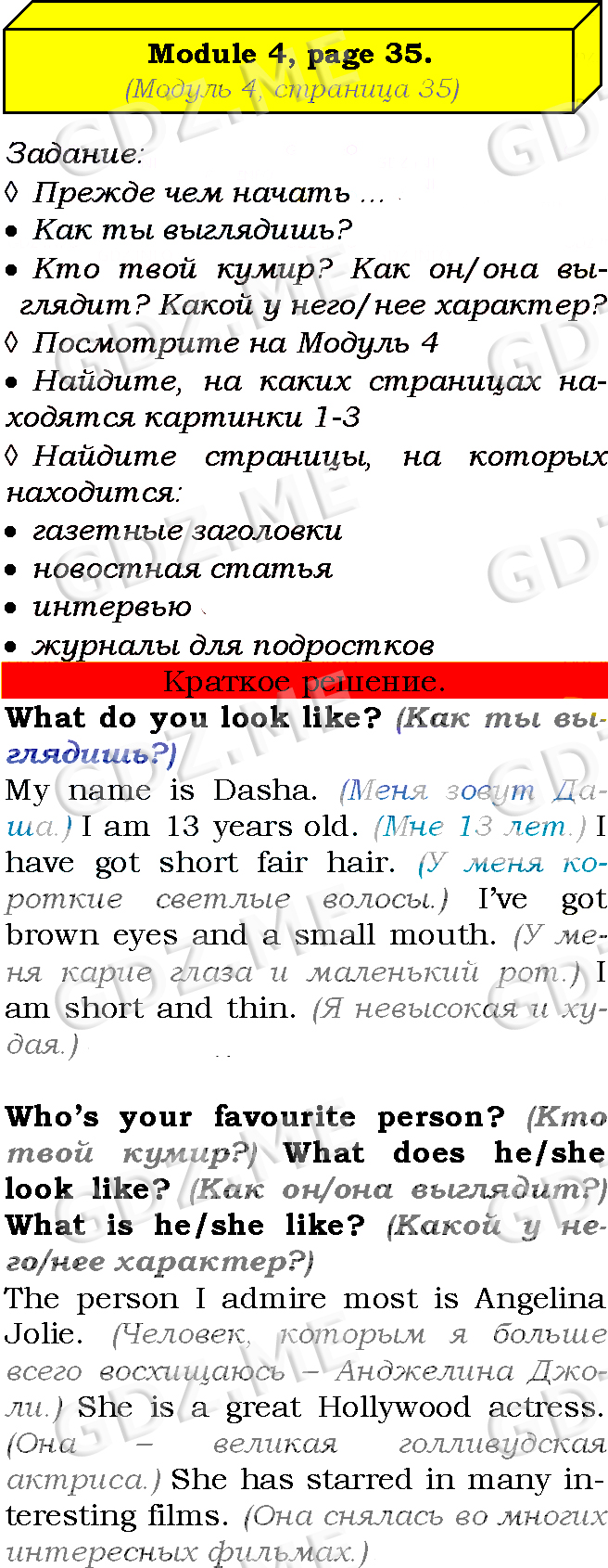 Подробный вариант решения из решебника (ГДЗ): Страница номер 35-4 (Module 3. Profiles. Module 4. In the news. Страница 35) по предмету Английский язык, за 7 класс, авторы учебника Ю.Е. Ваулина, Д. Дули, О.Е. Подолянко, В. Эванс.