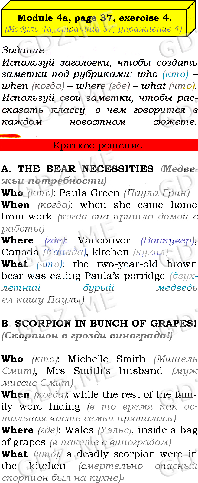 Подробный вариант решения из решебника (ГДЗ): Страница номер 37-4a-4 (Module 3. Profiles. Module 4. In the news. Страница 37) по предмету Английский язык, за 7 класс, авторы учебника Ю.Е. Ваулина, Д. Дули, О.Е. Подолянко, В. Эванс.