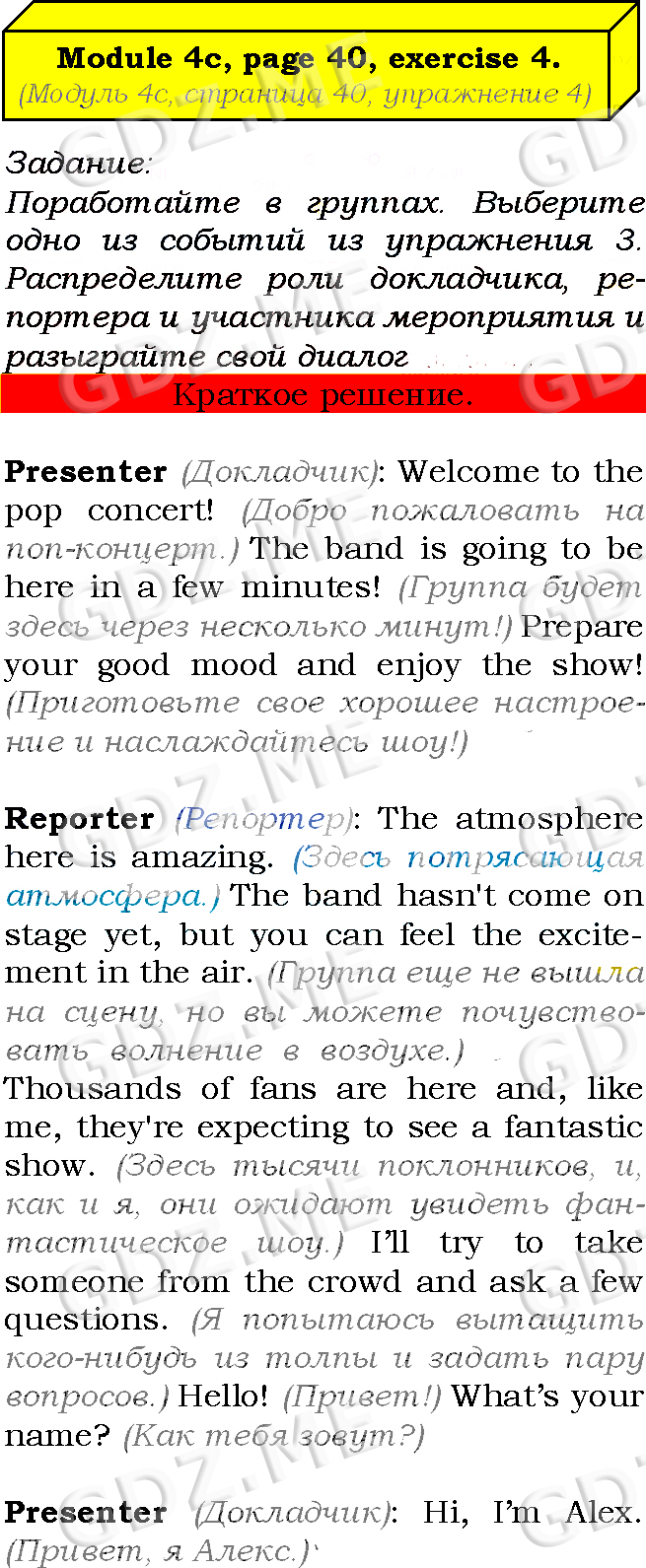 Подробный вариант решения из решебника (ГДЗ): Страница номер 40-4c-4 (Module 3. Profiles. Module 4. In the news. Страница 40) по предмету Английский язык, за 7 класс, авторы учебника Ю.Е. Ваулина, Д. Дули, О.Е. Подолянко, В. Эванс.