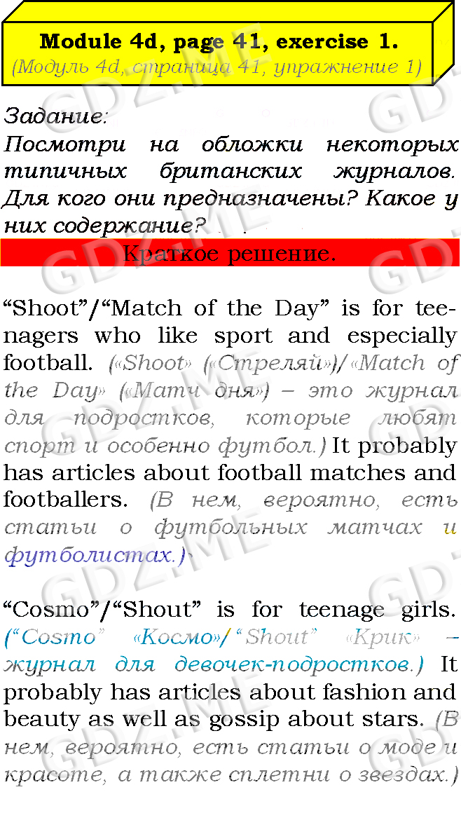Подробный вариант решения из решебника (ГДЗ): Страница номер 41-4d-1 (Module 3. Profiles. Module 4. In the news. Страница 41) по предмету Английский язык, за 7 класс, авторы учебника Ю.Е. Ваулина, Д. Дули, О.Е. Подолянко, В. Эванс.