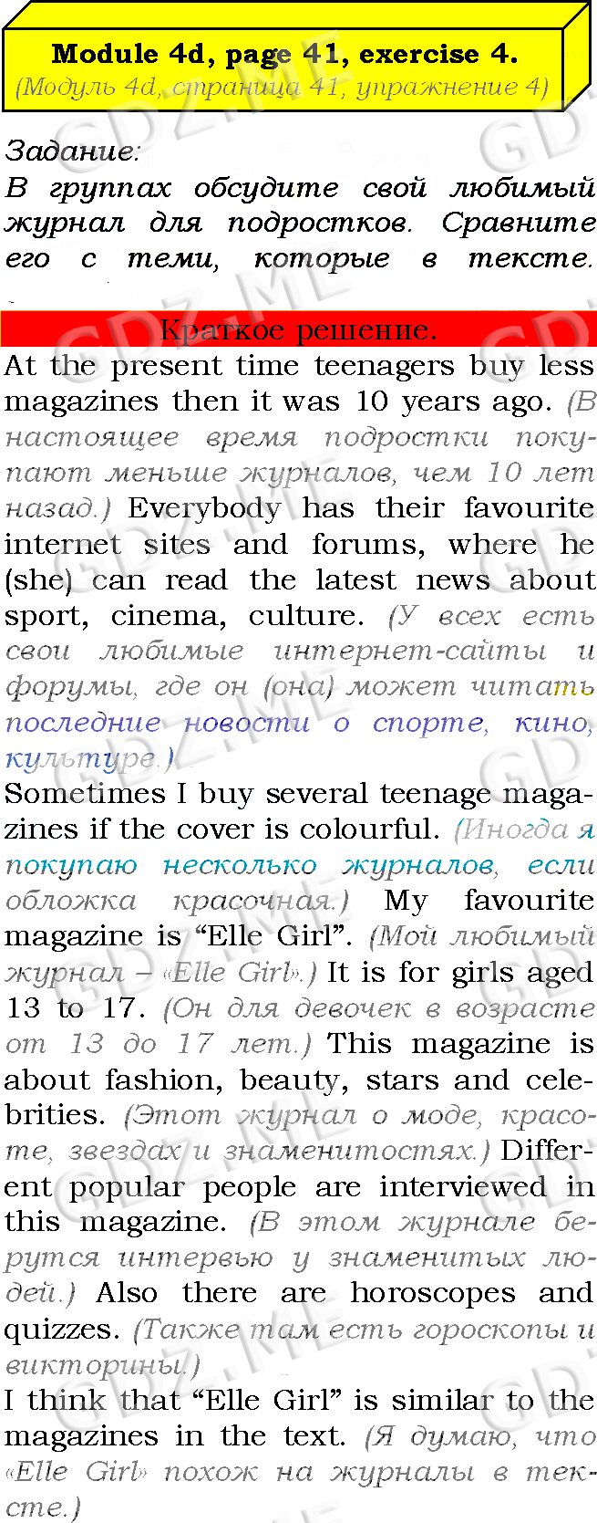 Подробный вариант решения из решебника (ГДЗ): Страница номер 41-4d-4 (Module 3. Profiles. Module 4. In the news. Страница 41) по предмету Английский язык, за 7 класс, авторы учебника Ю.Е. Ваулина, Д. Дули, О.Е. Подолянко, В. Эванс.
