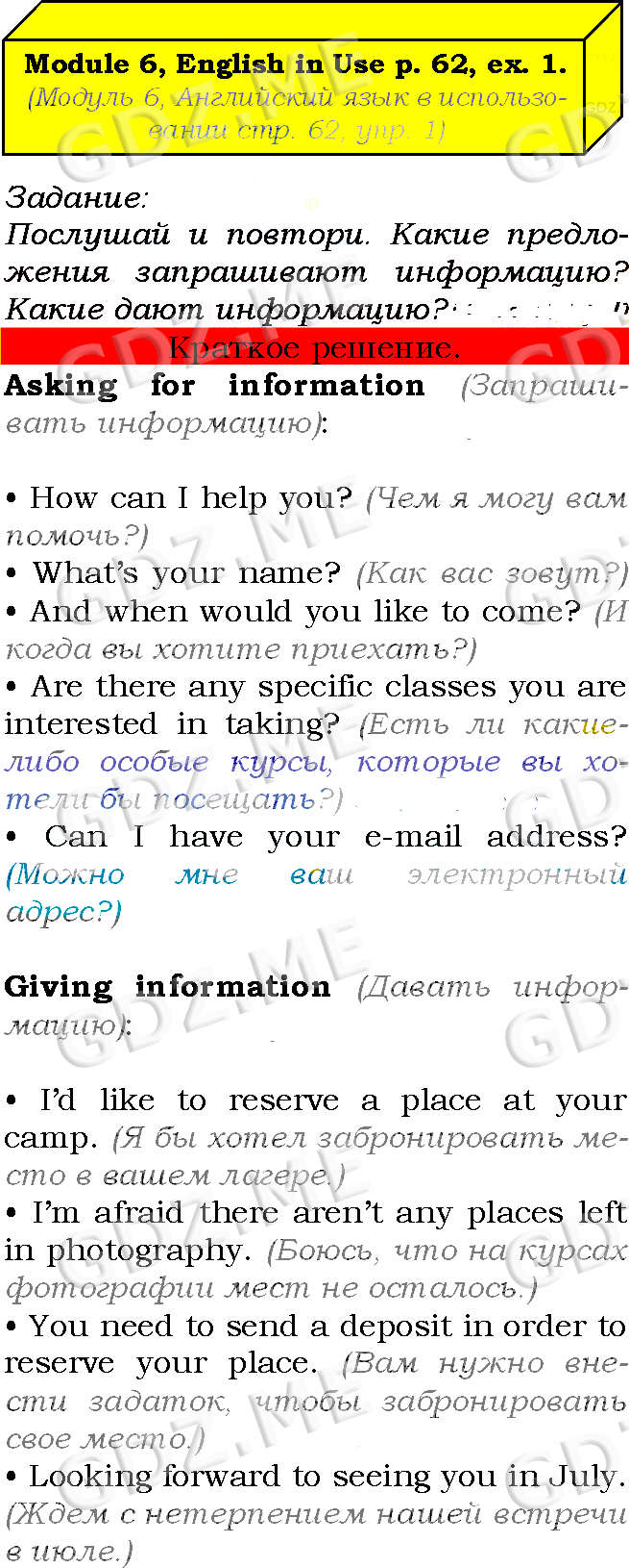 Подробный вариант решения из решебника (ГДЗ): Страница номер 62-6-1 (Module 5. What the future holds. Module 6. Having fun. Страница 62) по предмету Английский язык, за 7 класс, авторы учебника Ю.Е. Ваулина, Д. Дули, О.Е. Подолянко, В. Эванс.
