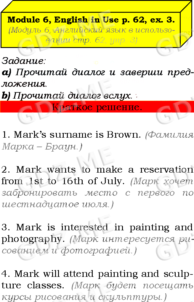 Подробный вариант решения из решебника (ГДЗ): Страница номер 62-6-3 (Module 5. What the future holds. Module 6. Having fun. Страница 62) по предмету Английский язык, за 7 класс, авторы учебника Ю.Е. Ваулина, Д. Дули, О.Е. Подолянко, В. Эванс.