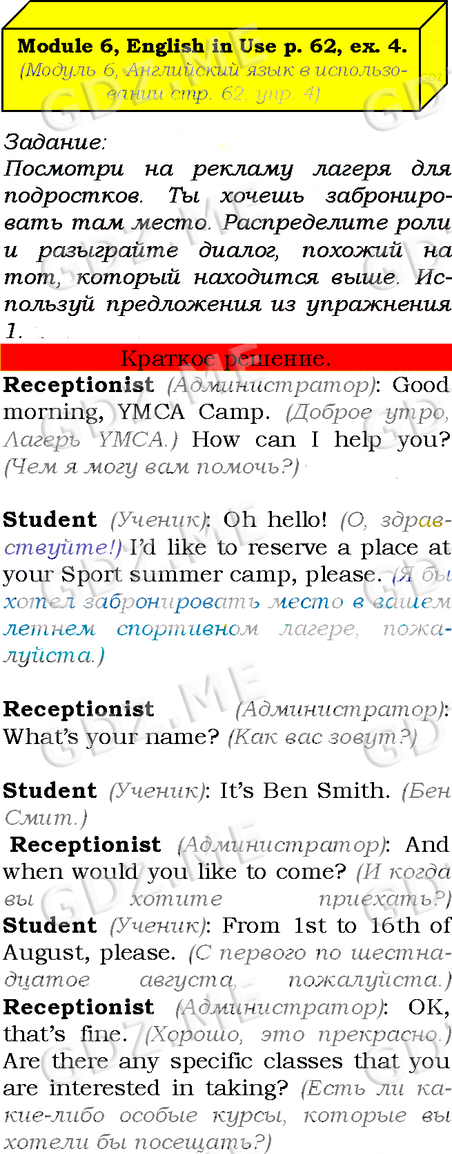 Подробный вариант решения из решебника (ГДЗ): Страница номер 62-6-4 (Module 5. What the future holds. Module 6. Having fun. Страница 62) по предмету Английский язык, за 7 класс, авторы учебника Ю.Е. Ваулина, Д. Дули, О.Е. Подолянко, В. Эванс.