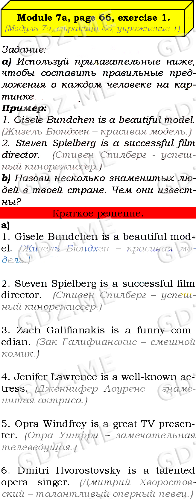 Подробный вариант решения из решебника (ГДЗ): Страница номер 66-7a-1 (Module 6. Having fun. Module 7. In the spotlight. Страница 66) по предмету Английский язык, за 7 класс, авторы учебника Ю.Е. Ваулина, Д. Дули, О.Е. Подолянко, В. Эванс.